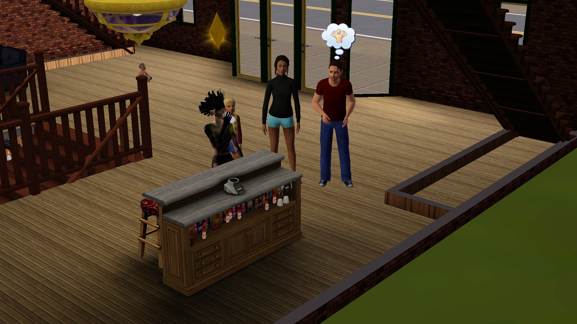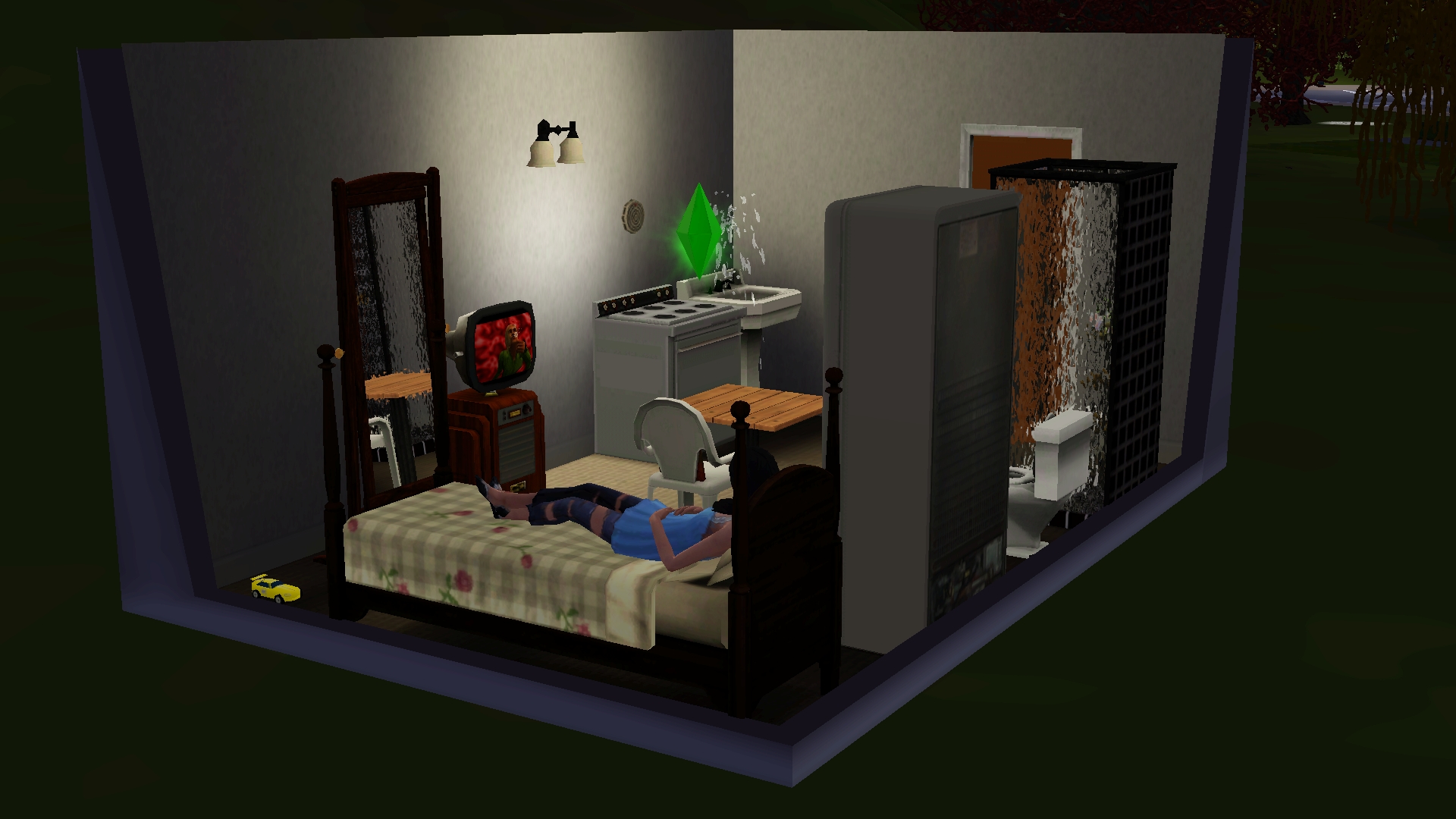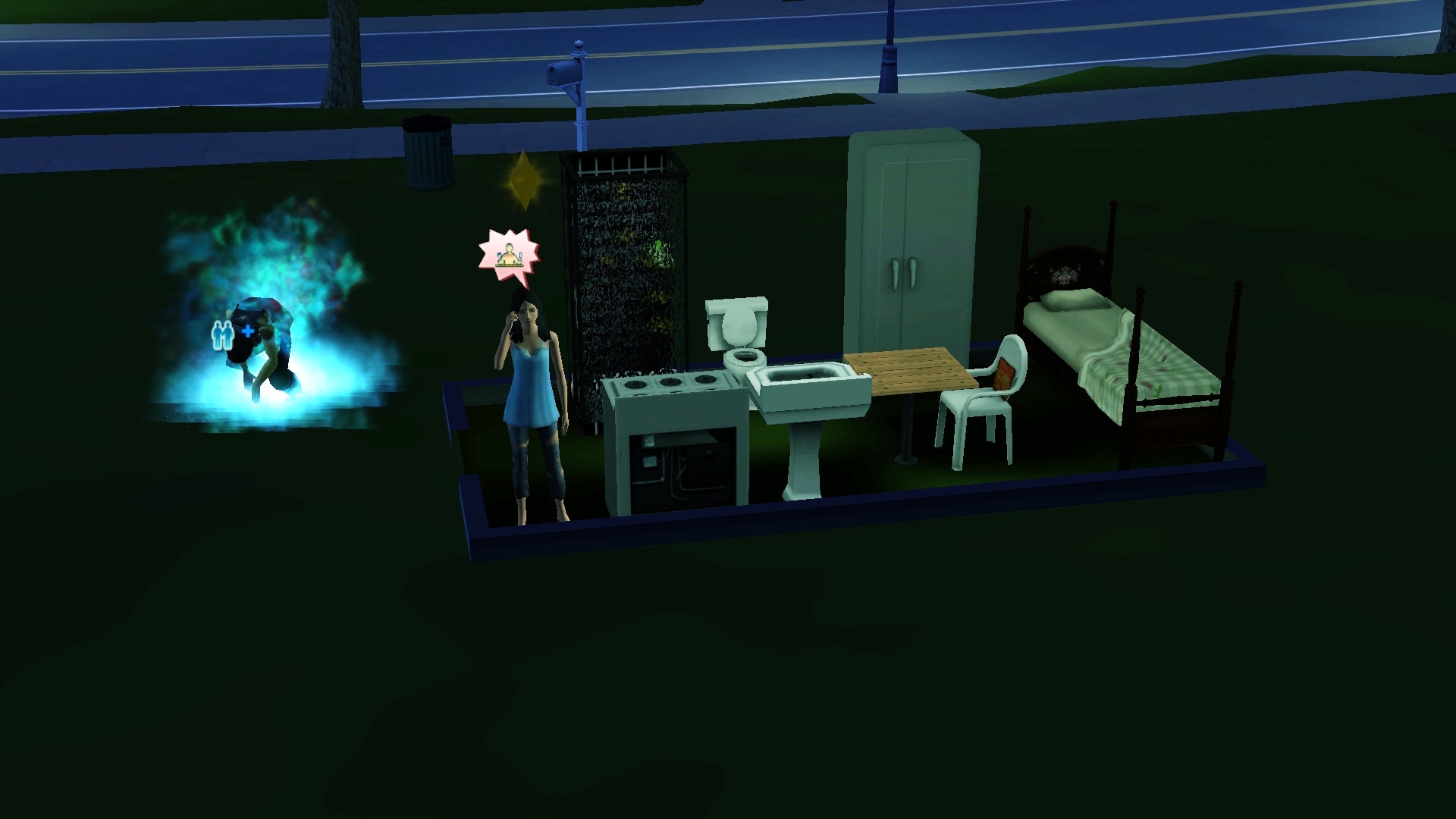 Headed over to the gym to chug some drinks and shower, (then I finally remember TS3 has collectibles), so she headed back over to the meteor and got $4,000 in space rocks. With that, she had enough money to start on a little house with the things she wanted to buy, starting with a bed, stove, fridge, toilet, and shower. SheI didn't have quite enough money to finish building walls, which was unfortunate when it started to rain. Before that though, she hung around town to socialize and ran into Shockwave, who she immediately hit it off with.
