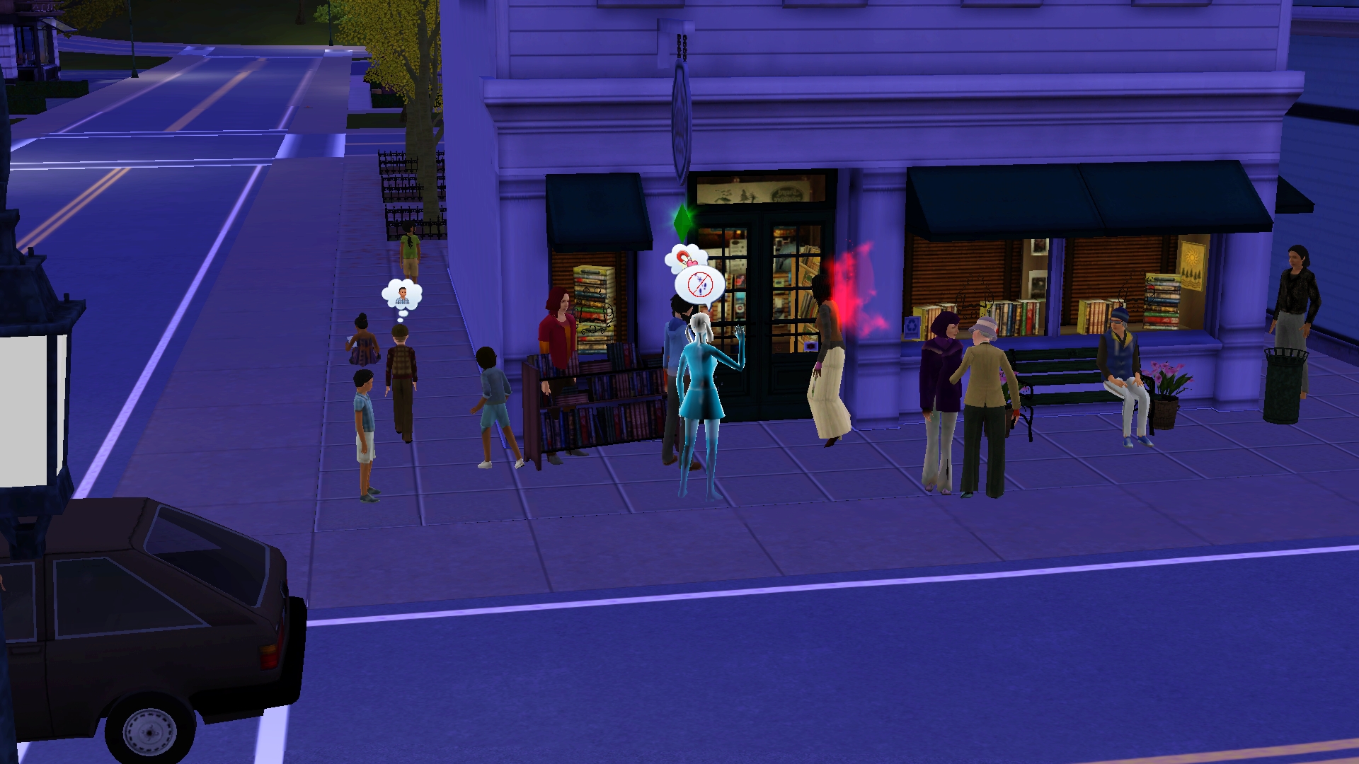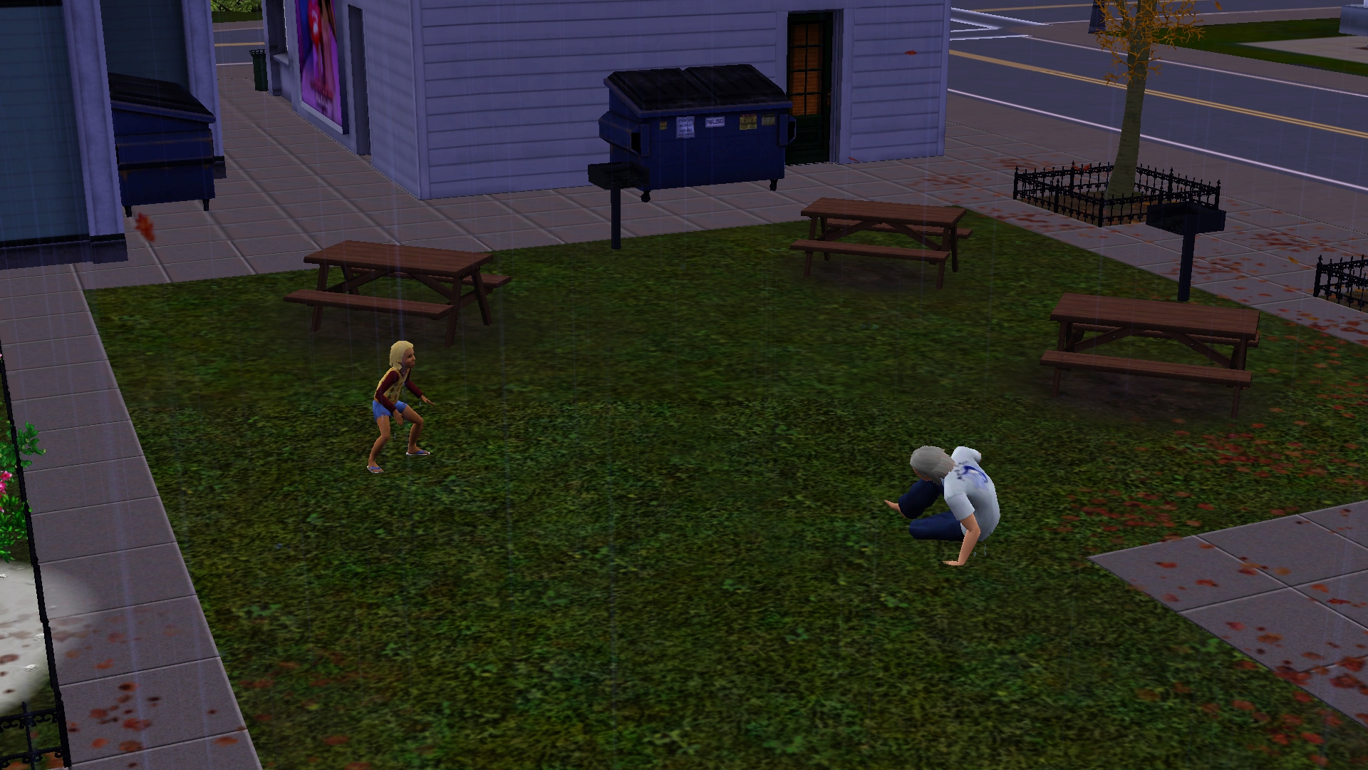Finally, Shockwave called her, and... zombies spawned at the same time?! (To be honest, I never played TS3 with Supernatural before, so I didn't even realize these were in the game to this degree.) One got stuck outside her door tweaking, and also she herself spawned as a zombie... and immediately walked off and got into a car?! Okay.